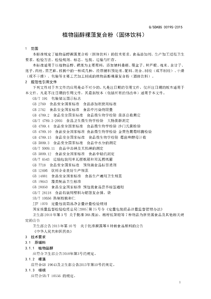 Q/SDABS 0019S-2015 山东奥博森医药科技有限公司 植物甾醇裸藻复合粉(固体饮料)