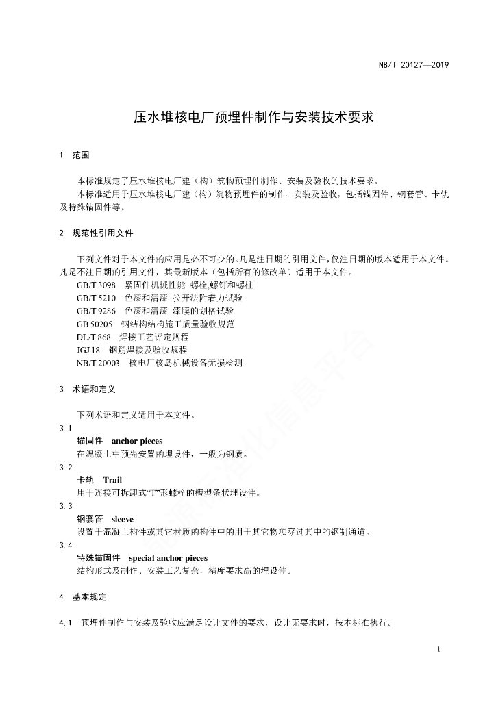 NB/T 20127-2019 压水堆核电厂预埋件制作与安装技术要求