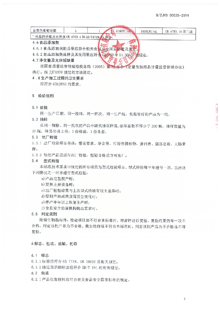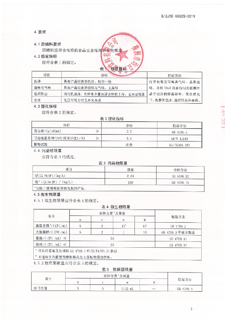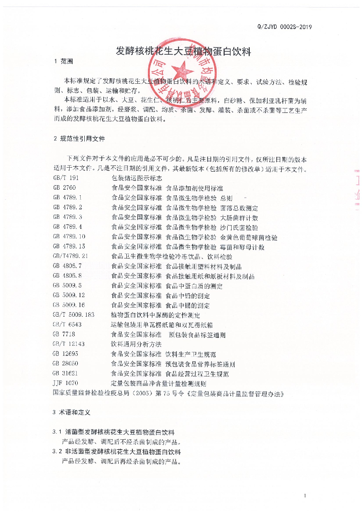 Q/ZJYD 0002S-2019 发酵核桃花生大豆植物蛋白饮料