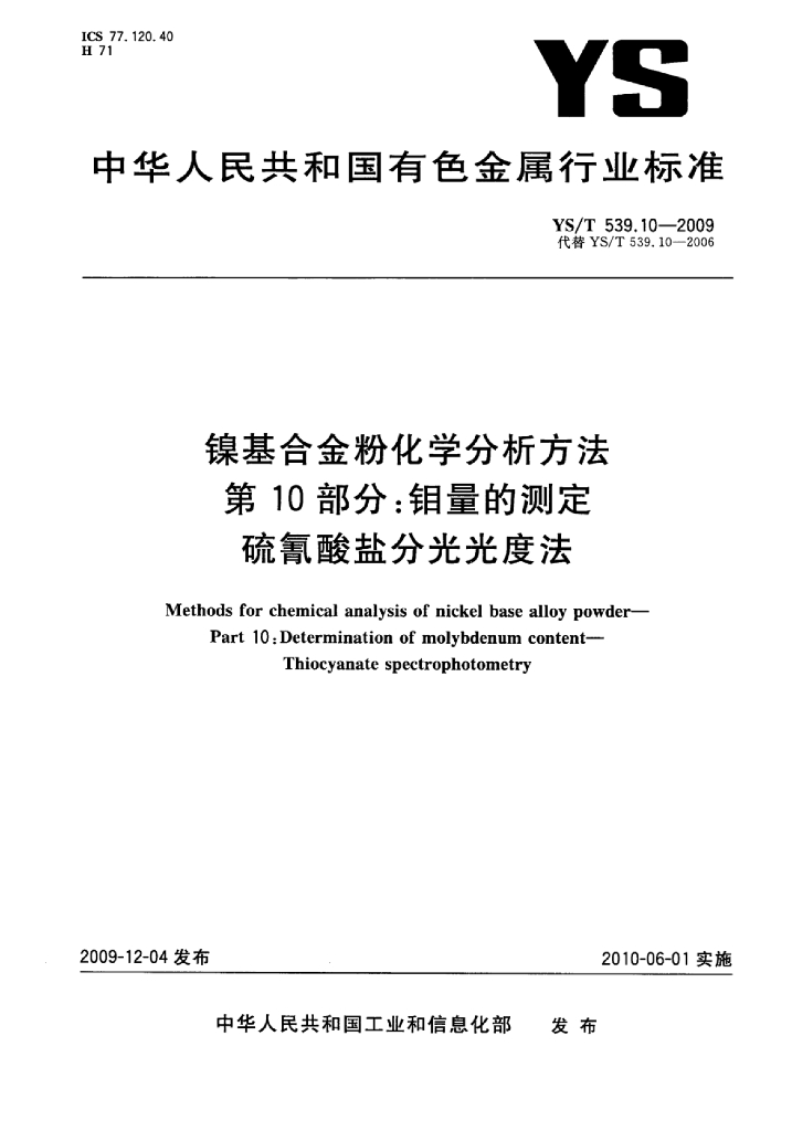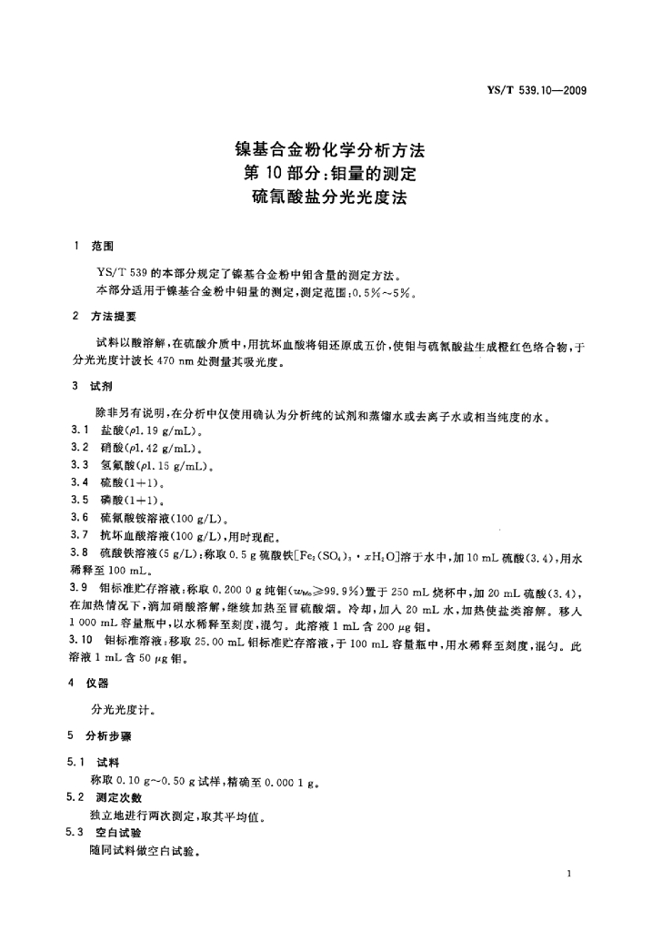 YS/T 539.10-2009 镍基合金粉化学分析方法 第10部分:钼量的测定硫氰酸盐分光光度法