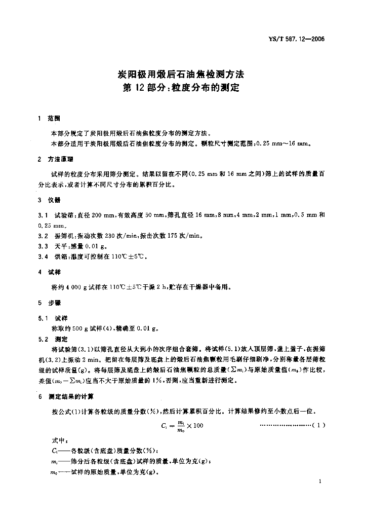 YS/T 587.12-2006 炭阳极用煅后石油焦检测方法 第12部分:粒度分布的测定