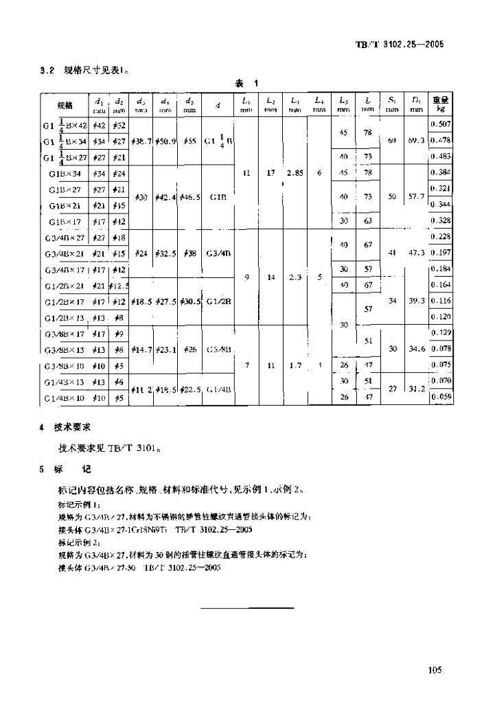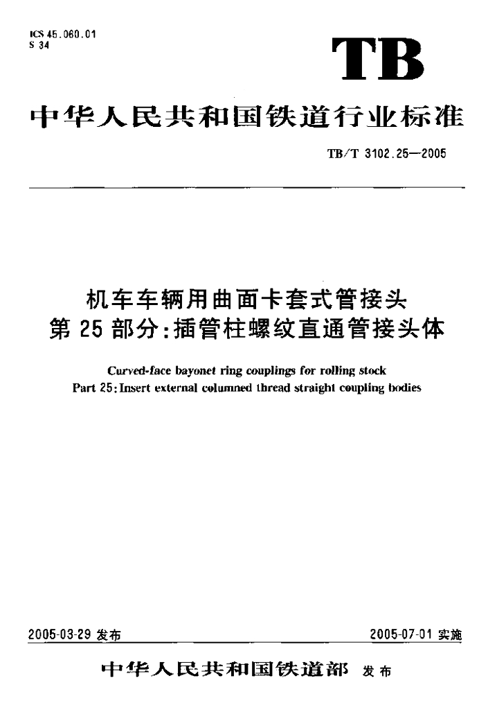 TB/T 3102.25-2005 机车车辆用曲面卡套式管接头 第25部分:插管柱螺纹直通管接头体