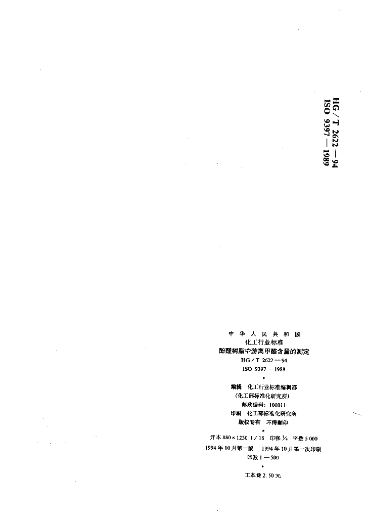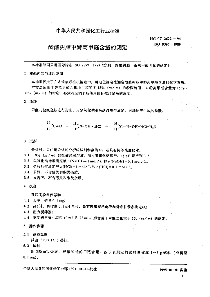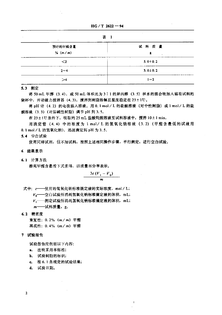 HG/T 2622-1994 酚醛树脂中游离甲醛含量的测定