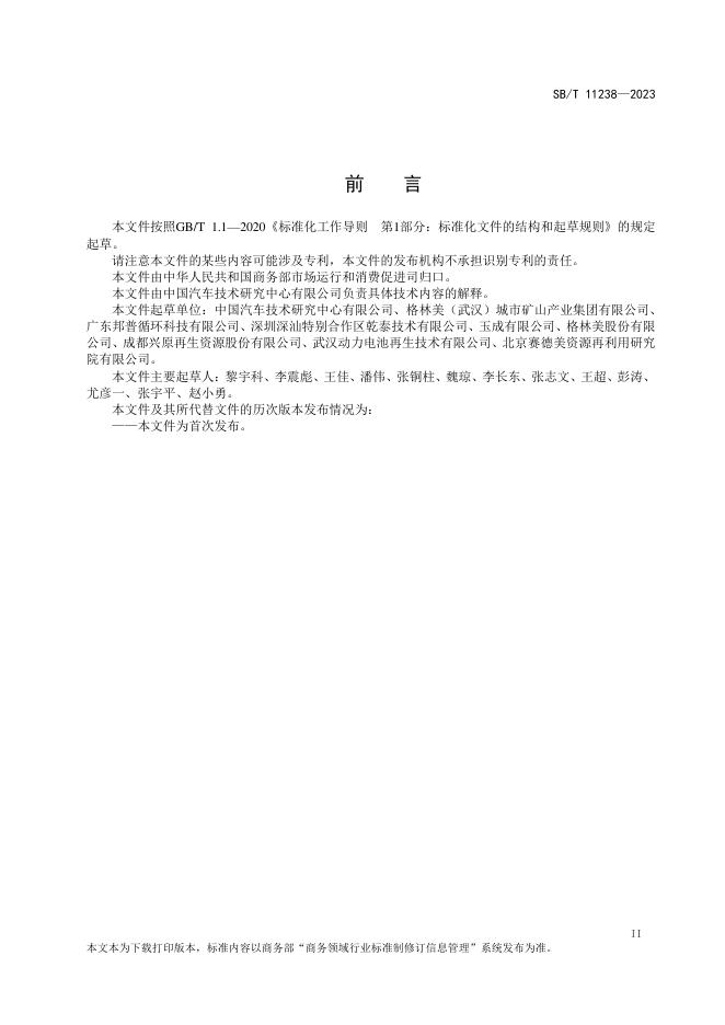 中国汽车技术研究中心有限公司、格林美(武汉)城市矿山产业集团有限公司、广东邦普循环科技有限公司、深圳深汕特别合作区乾泰技术有限公司、玉成有限公司、格林美股份有限公司、成都兴原再生资源股份有限公司、武汉动力电池再生技术有限公司、北京赛德美资源再利用研究院有限公司