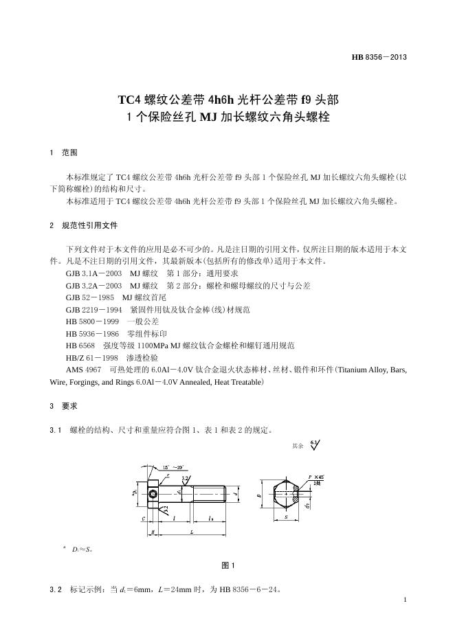 HB 8356-2013(2017) TC4螺纹公差带4H6H光杆公差带F9头部1个保险丝孔MJ加长螺纹六角头螺栓