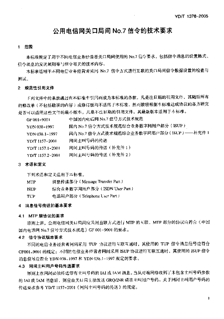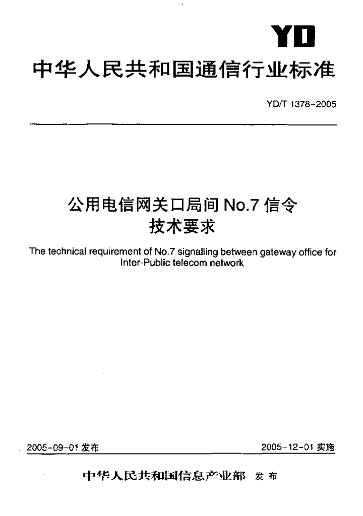 YD/T 1378-2005 公用电信网关口局间 No.7 信令技术要求