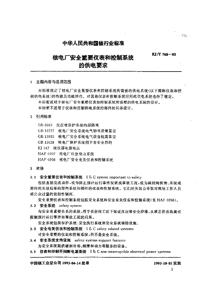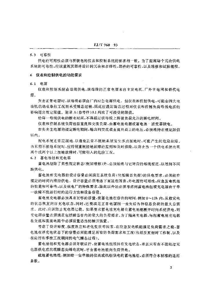 EJ/T 760-1993 核电厂安全重要仪表和控制系统的供电要求