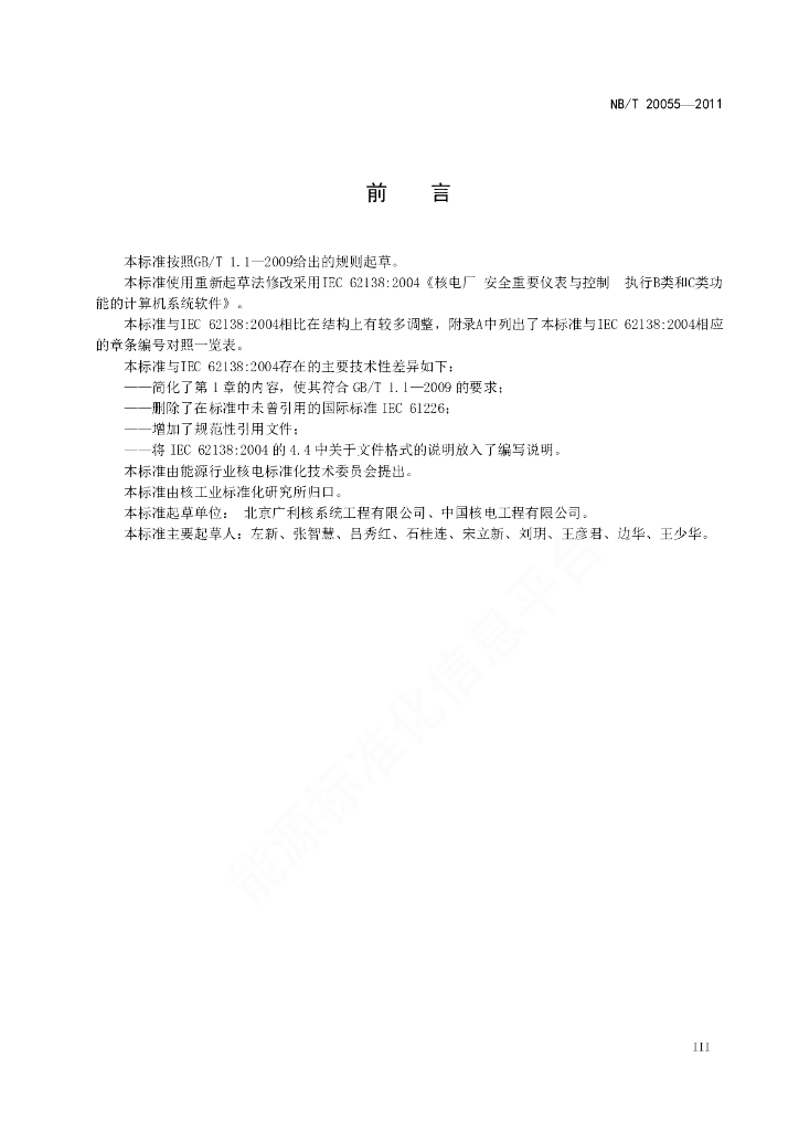NB/T 20055-2011 核电厂安全重要仪表和控制系统执行B类和C类功能的计算机软件