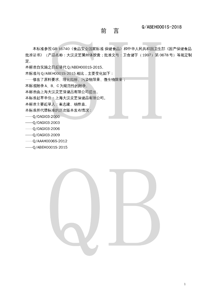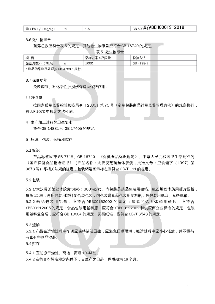 Q/ABEH 0001S-2018 大汉灵芝菌丝体胶囊