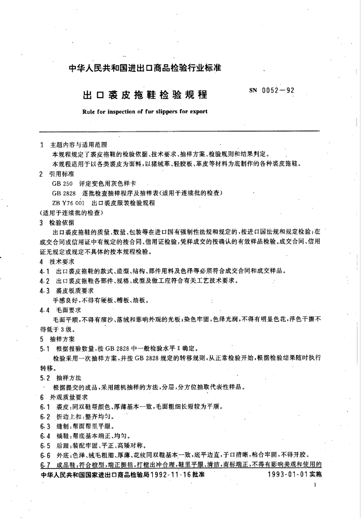 SN 0052-1992 出口裘皮拖鞋检验规程