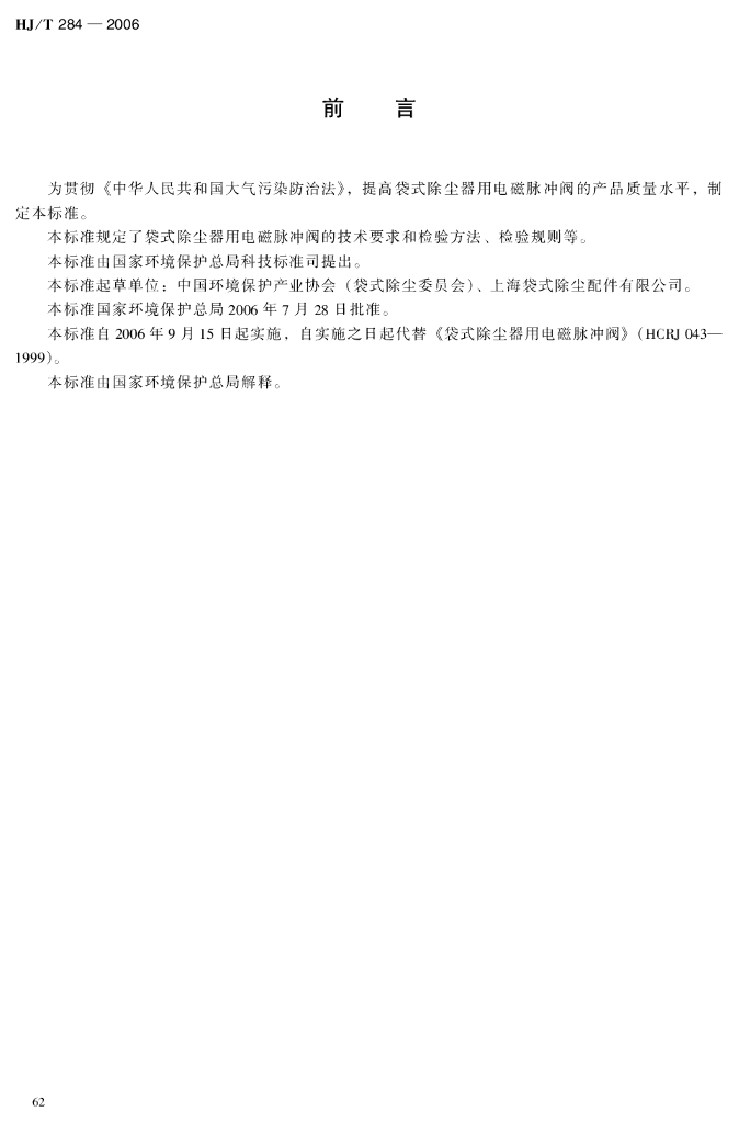 HJ/T 284-2006 环境保护产品技术要求 袋式除尘器用电磁脉冲阀
