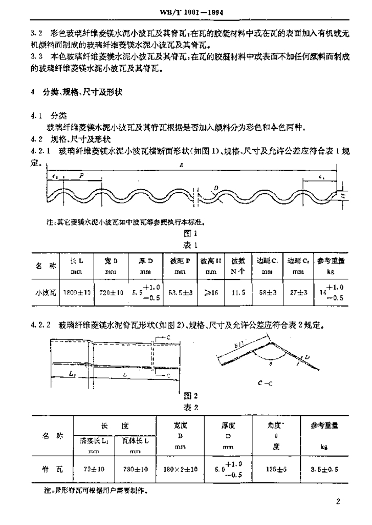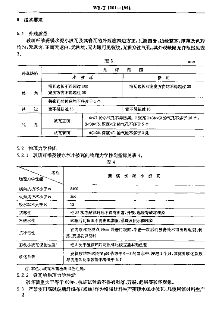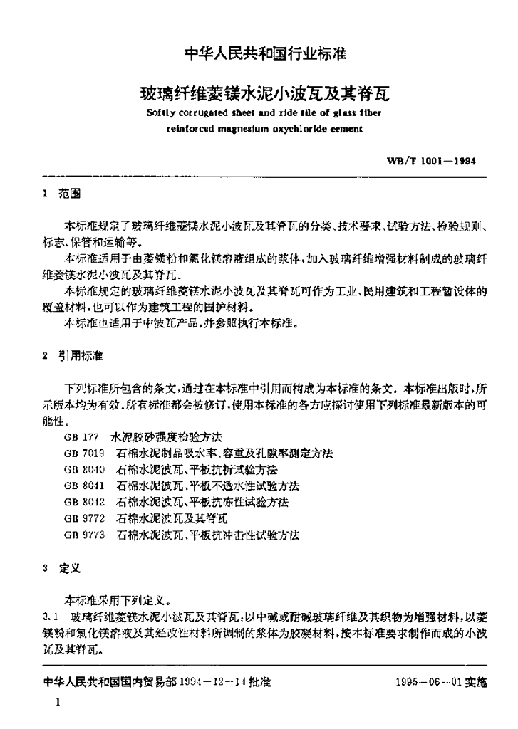 WB/T 1001-1994 玻璃纤维菱镁水泥小波瓦及其脊瓦