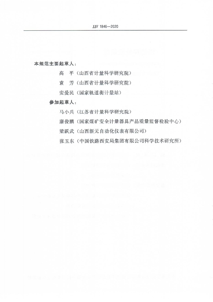 高平(山西省计量科学研究院)、袁芳(山西省计量科学研究院)、安爱民(国家轨道衡计量站)、马小兵(江苏省计量科学研究院)、康俊鹏(国家煤矿安全计量器具产品质量监督检验中心)、梁跃武(山西新元自动化仪表有限公司)、张玉东(中国铁路西安局集团有限公司科学技术研究所)
