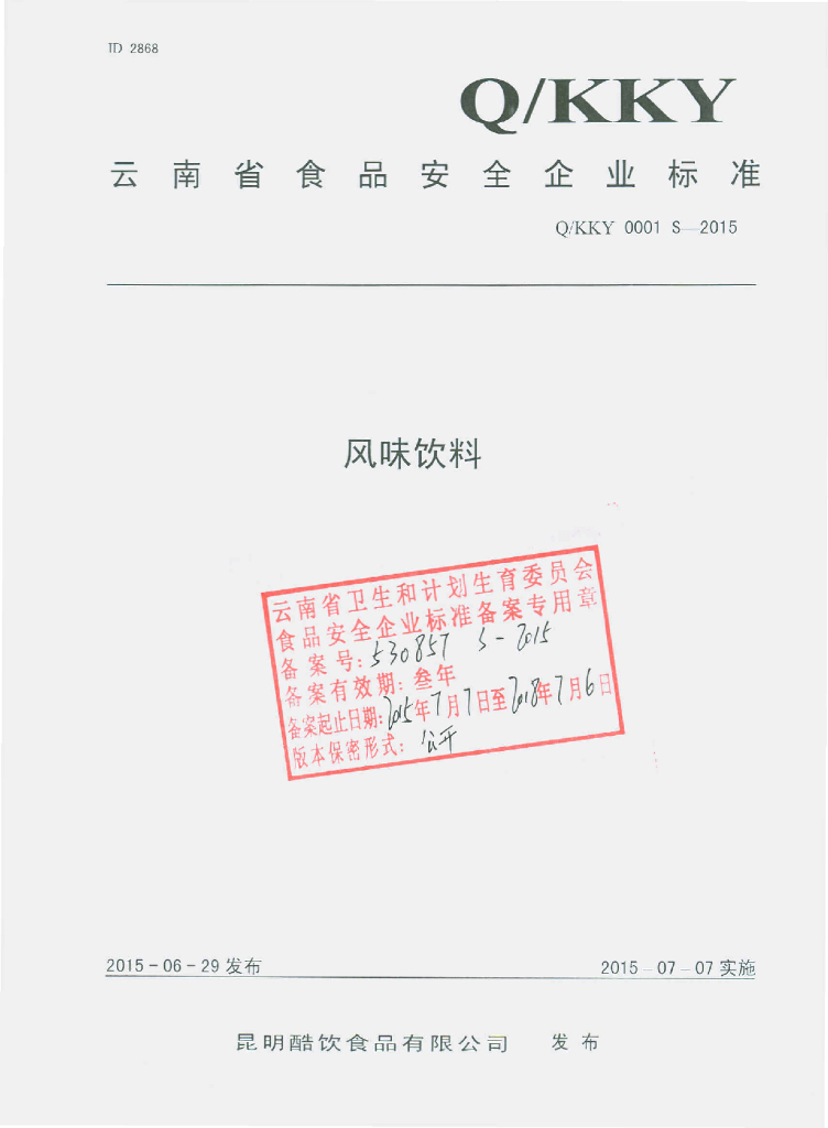 Q/KKY 0001S-2015 昆明酷饮食品有限公司 风味饮料