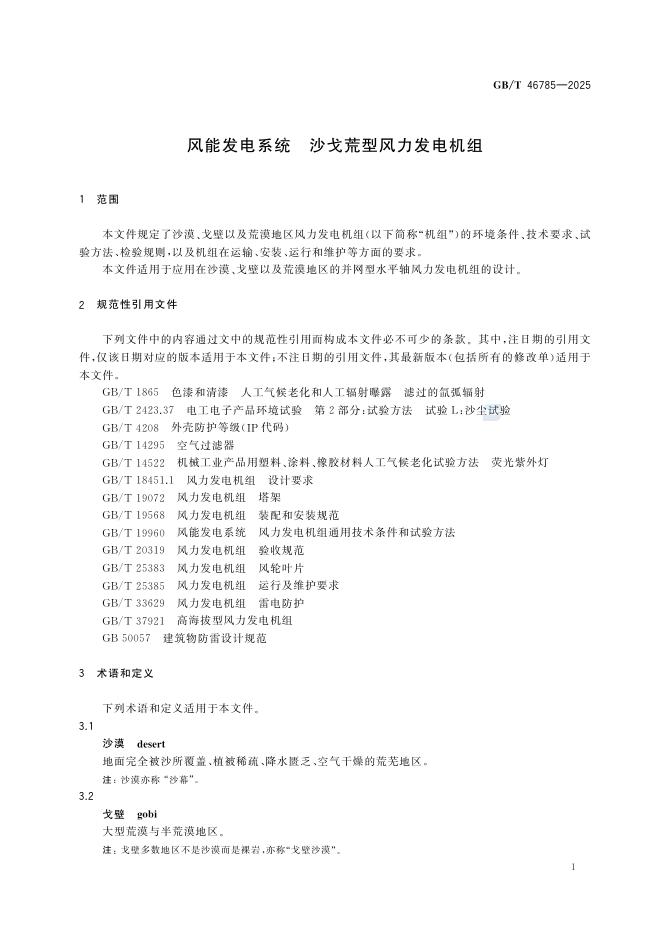 GB/T 46785-2025 风能发电系统 沙戈荒型风力发电机组