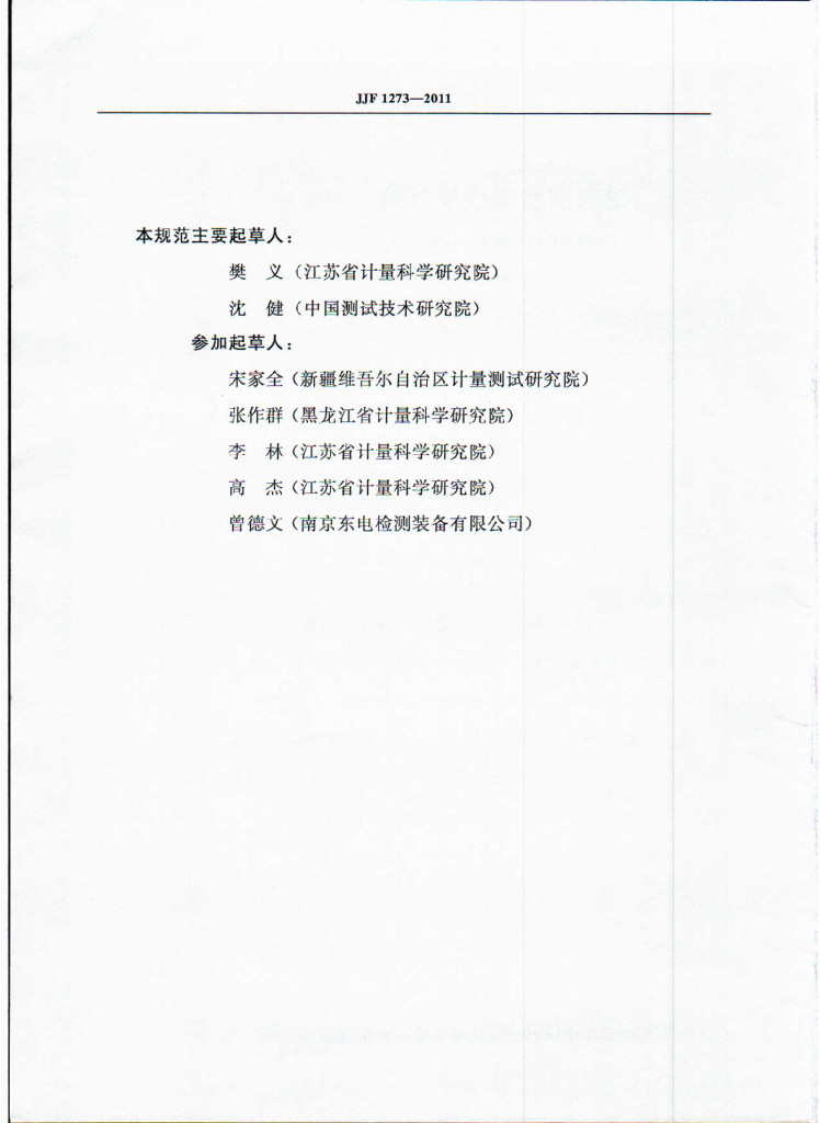 樊义(江苏省计量科学研究院)、沈健(中国测试技术研究院)、宋家全(新疆维吾尔自治区计量测试研究院)、张作群(黑龙江省计量科学研究院)、李林(江苏省计量科学研究院)、高杰(江苏省计量科学研究院)、曾德文(南京东电检测装备有限公司)