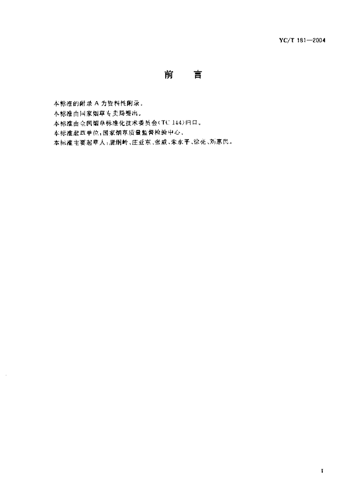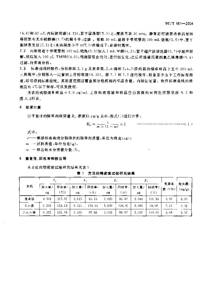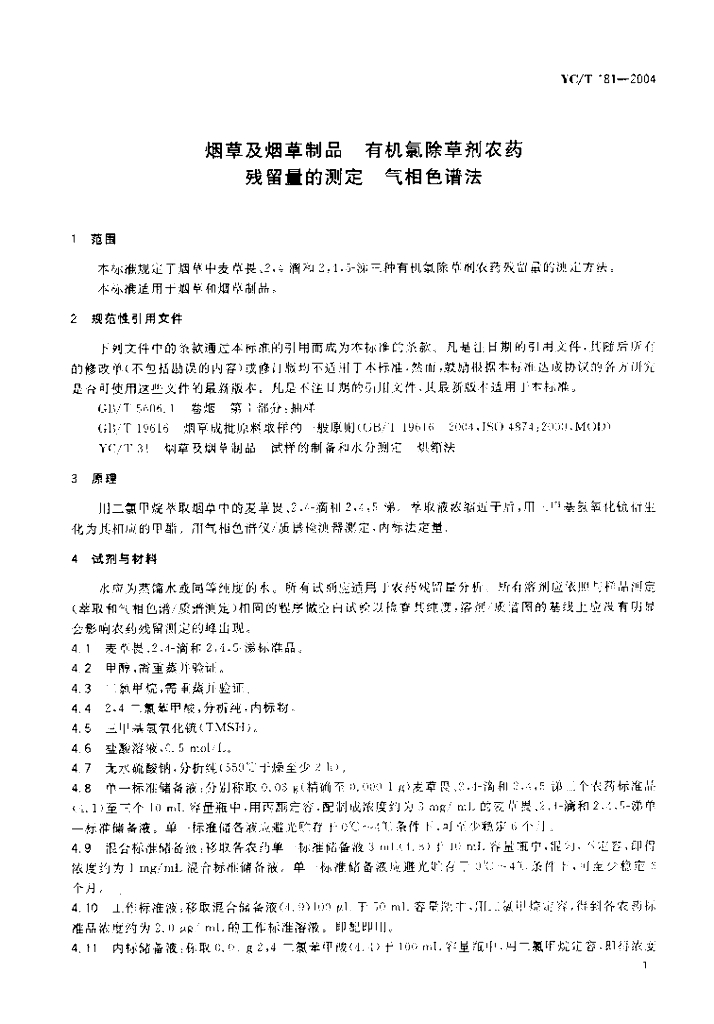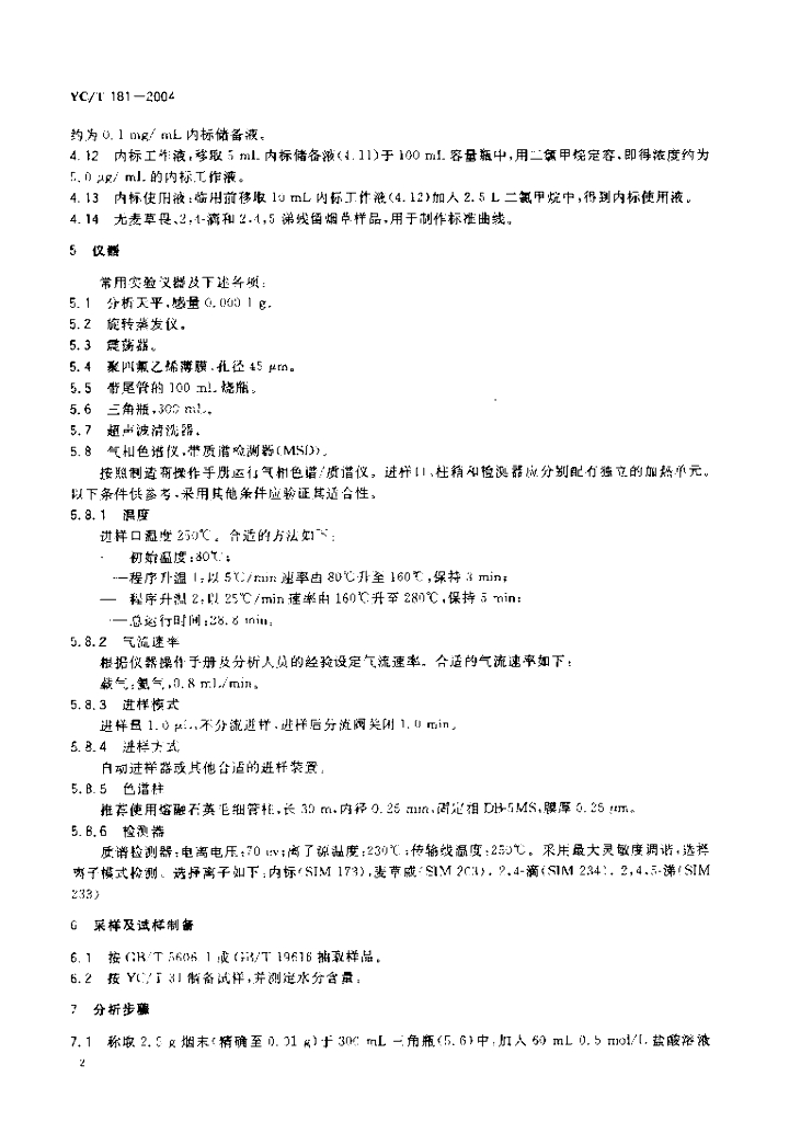 YC/T 181-2004 烟草及烟草制品 有机氯除草剂农药残留量的测定 气相色谱法