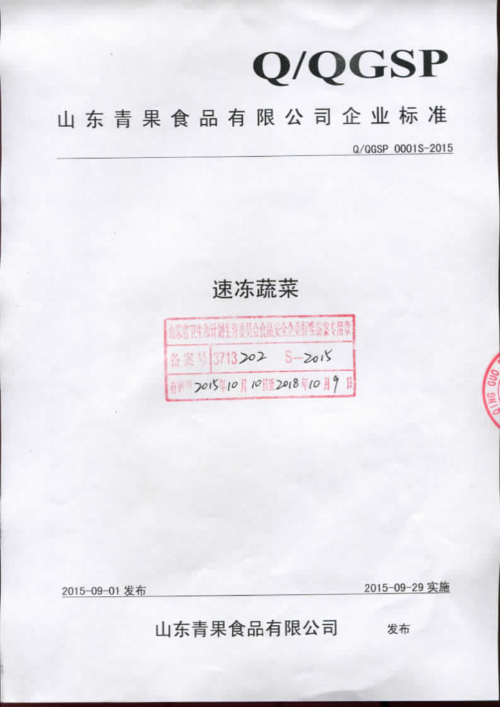 Q/QGSP 0001S-2015 山东青果食品有限公司 速冻蔬菜