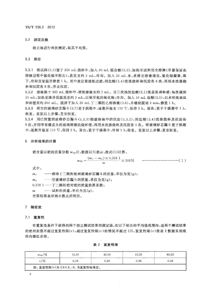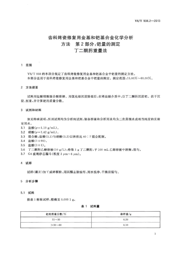 YS/T 938.2-2013 齿科烤瓷修复用金基和钯基合金化学分析方法 第2部分:钯量的测定丁二酮肟重量法