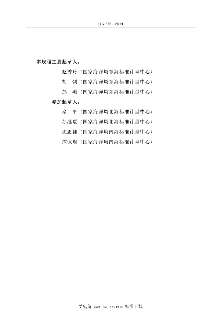 赵秀玲(国家海洋局东海标准计量中心)、胡剑(国家海洋局东海标准计量中心)、彭燕(国家海洋局东海标准计量中心)、秦平(国家海洋局北海标准计量中心)、苏继琨(国家海洋局北海标准计量中心)、沈思佳(国家海洋局南海标准计量中心)、应佩璇(国家海洋局南海标准计量中心)