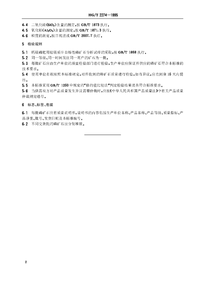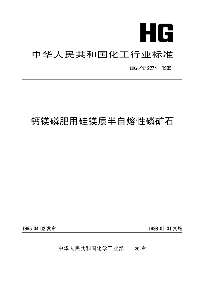 HG/T 2274-1995 钙镁磷肥用硅镁质半自熔性磷矿石