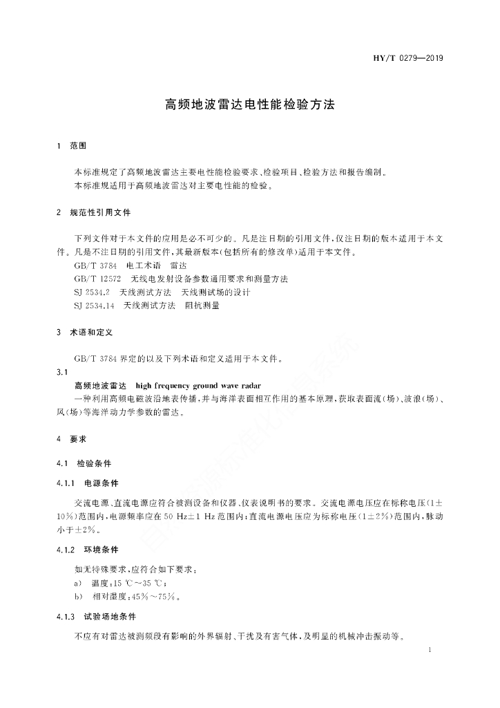 HY/T 0279-2019 高频地波雷达电性能检验方法