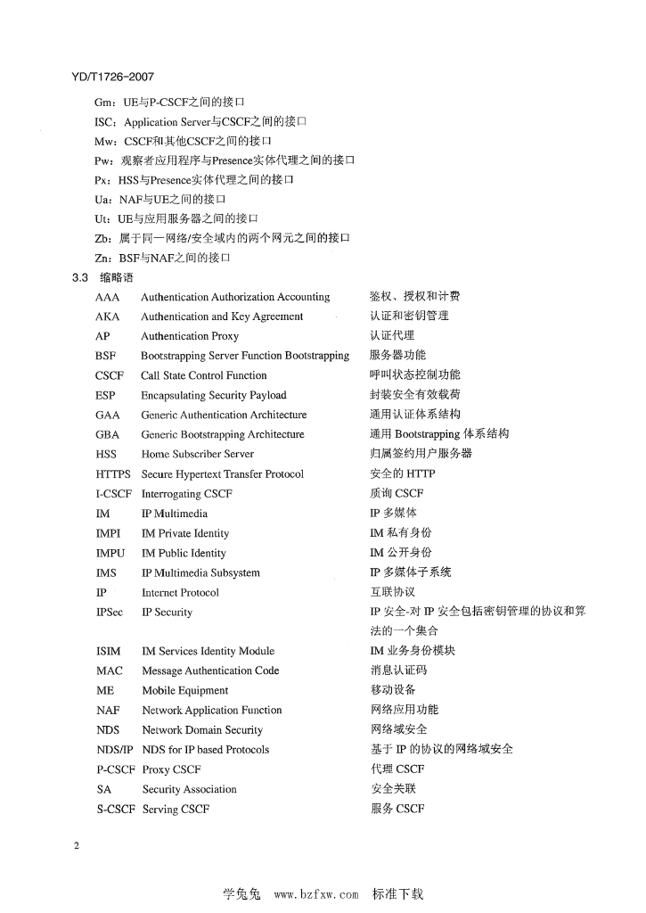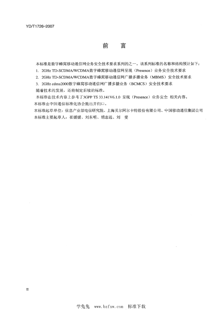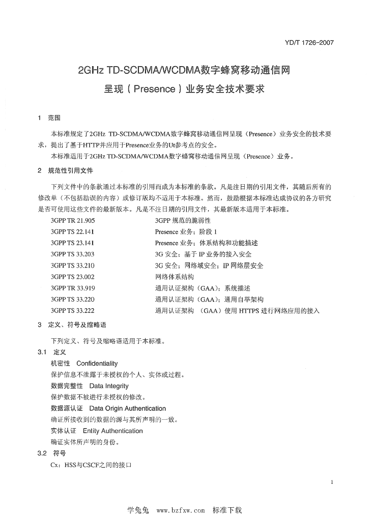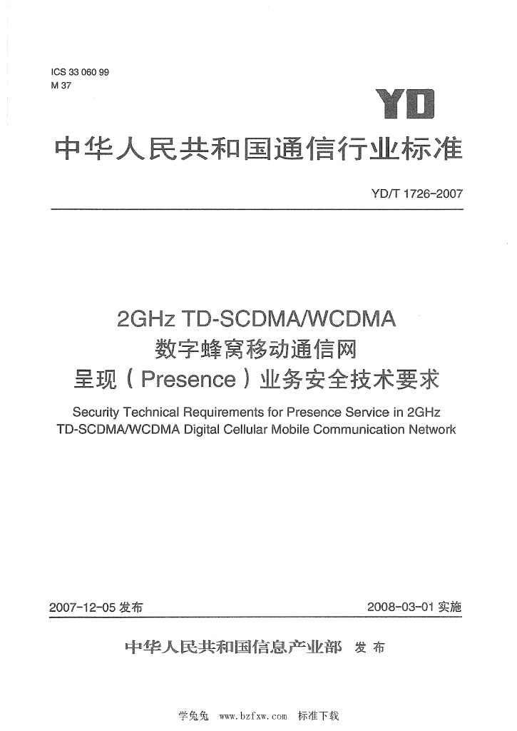 YD/T 1726-2007 2GHz TD-SCDMA WCDMA数字蜂窝移动通信网呈现(Presence)业务安全技术要求