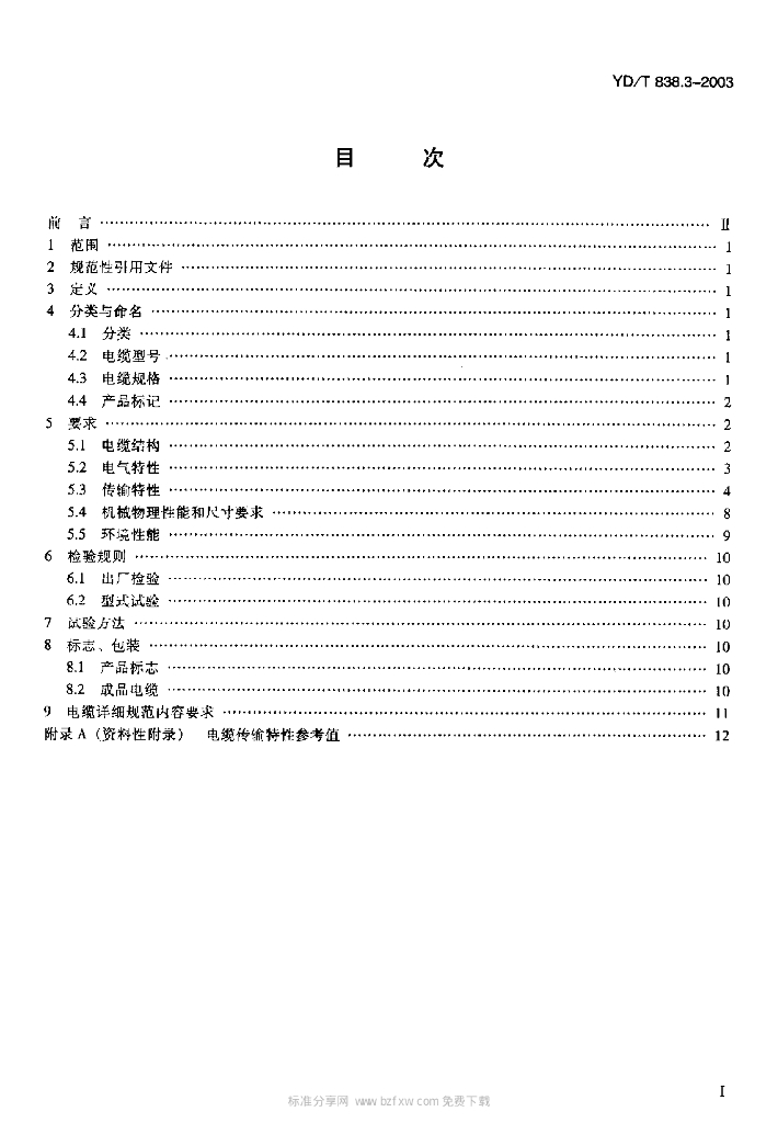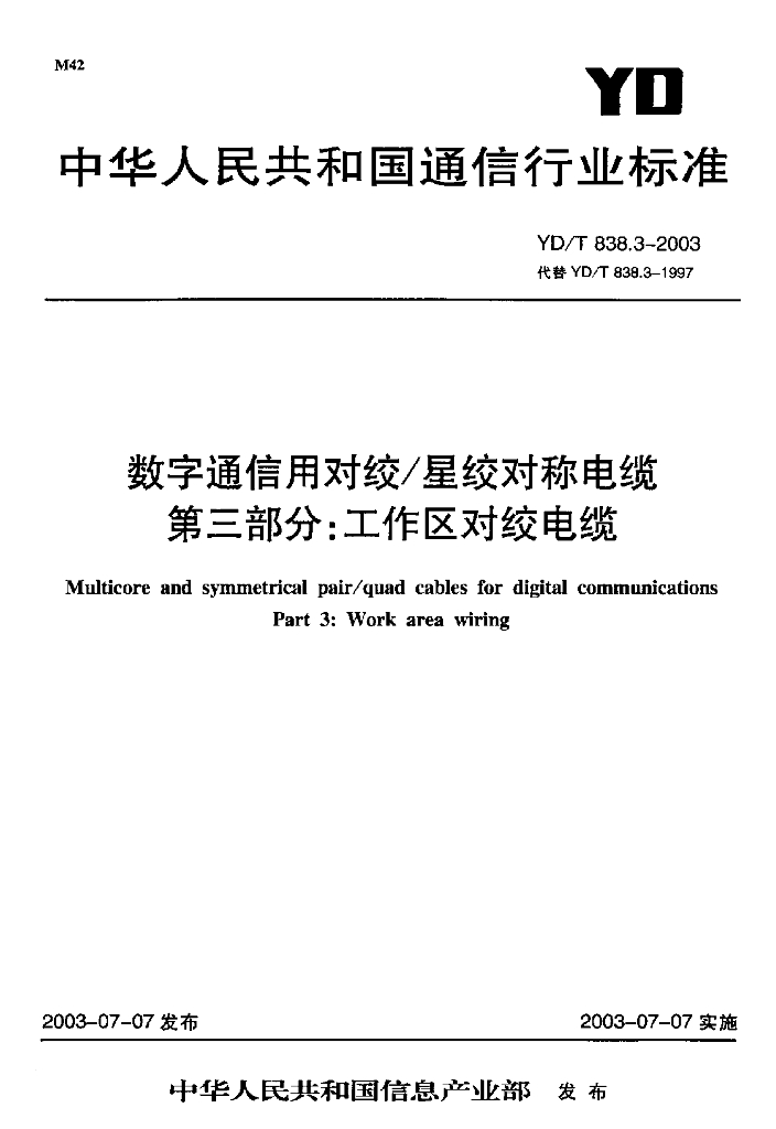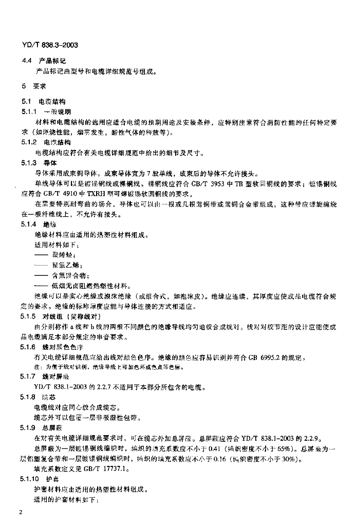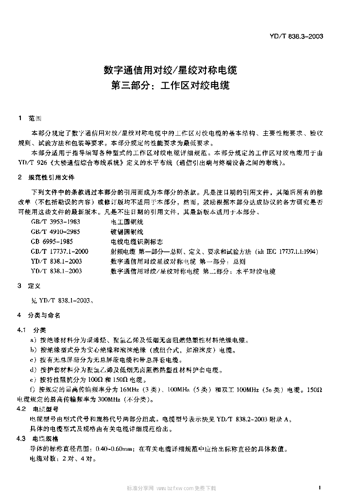 YD/T 838.3-2003 数字通信用对绞/星绞对称电缆 第三部分:工作区对绞电缆