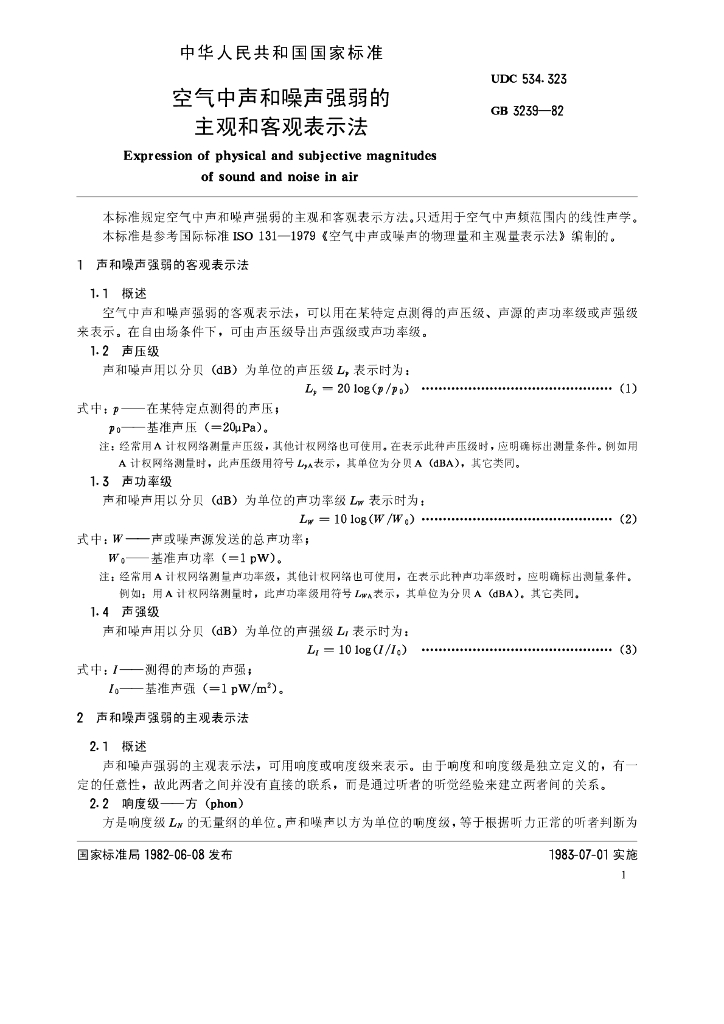 GB/T 3239-1982 空气中声和噪声强弱的主观和客观表示法