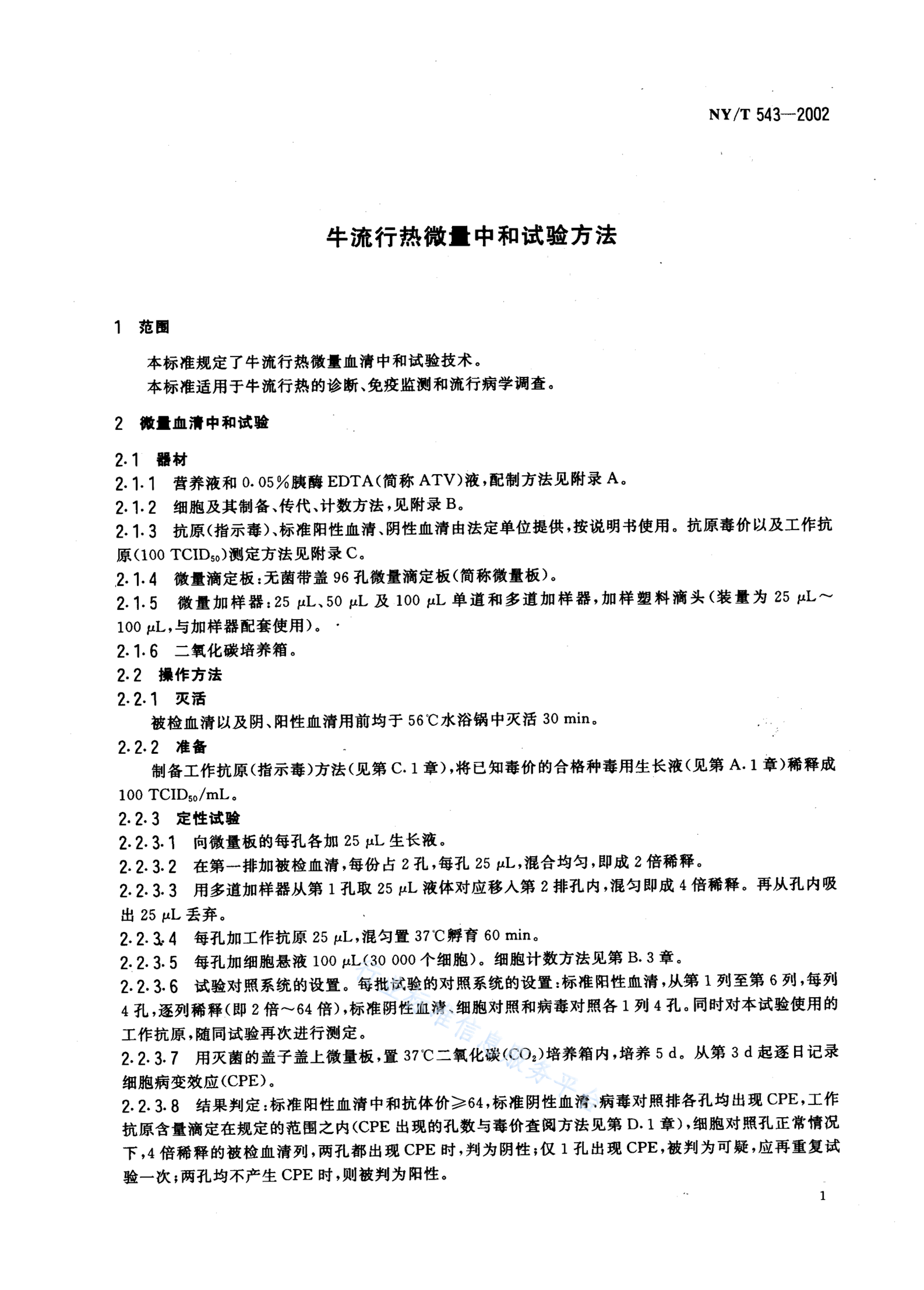 NY/T 543-2002 牛流行性热微量中和试验方法