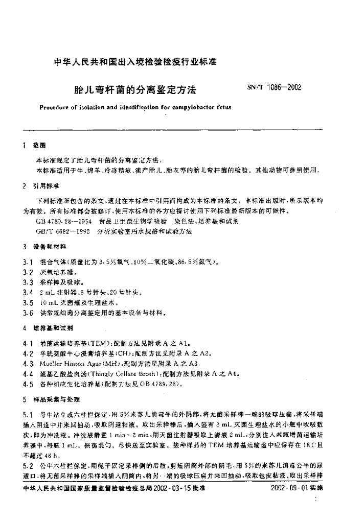 SN/T 1086-2002 胎儿弯杆菌的分离鉴定方法