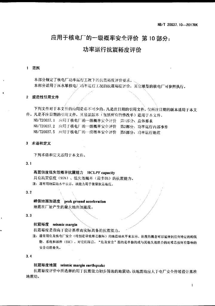 NB/T 20037.10-2017RK 应用于核电厂的一级概率安全评价 第10部分:功率运行抗震裕度评价