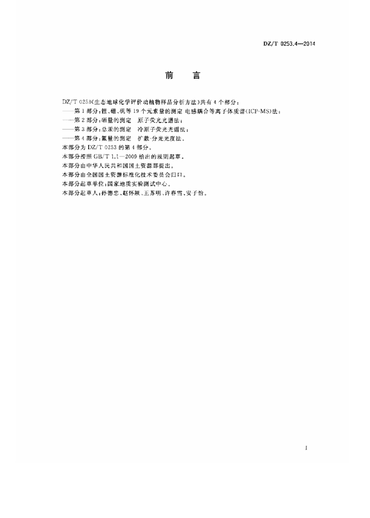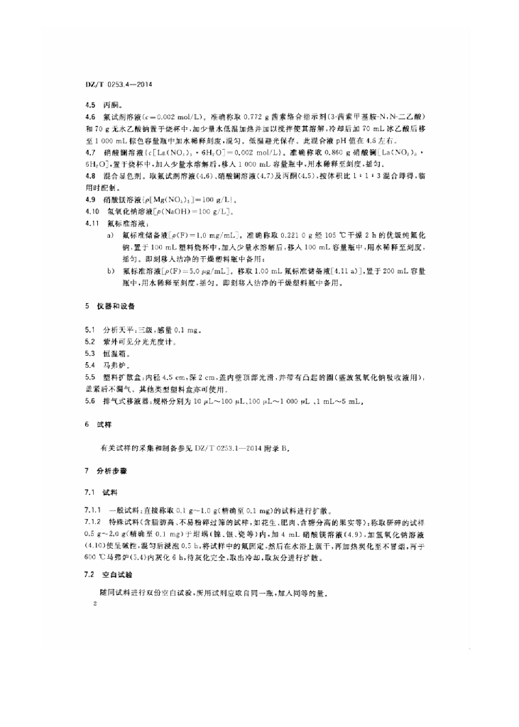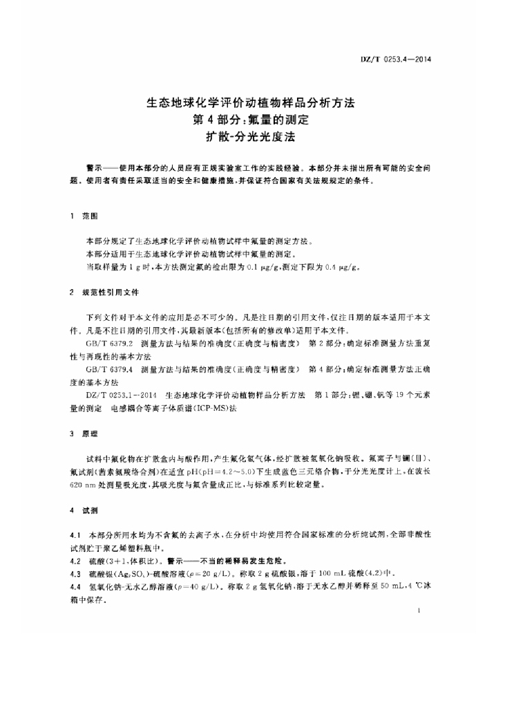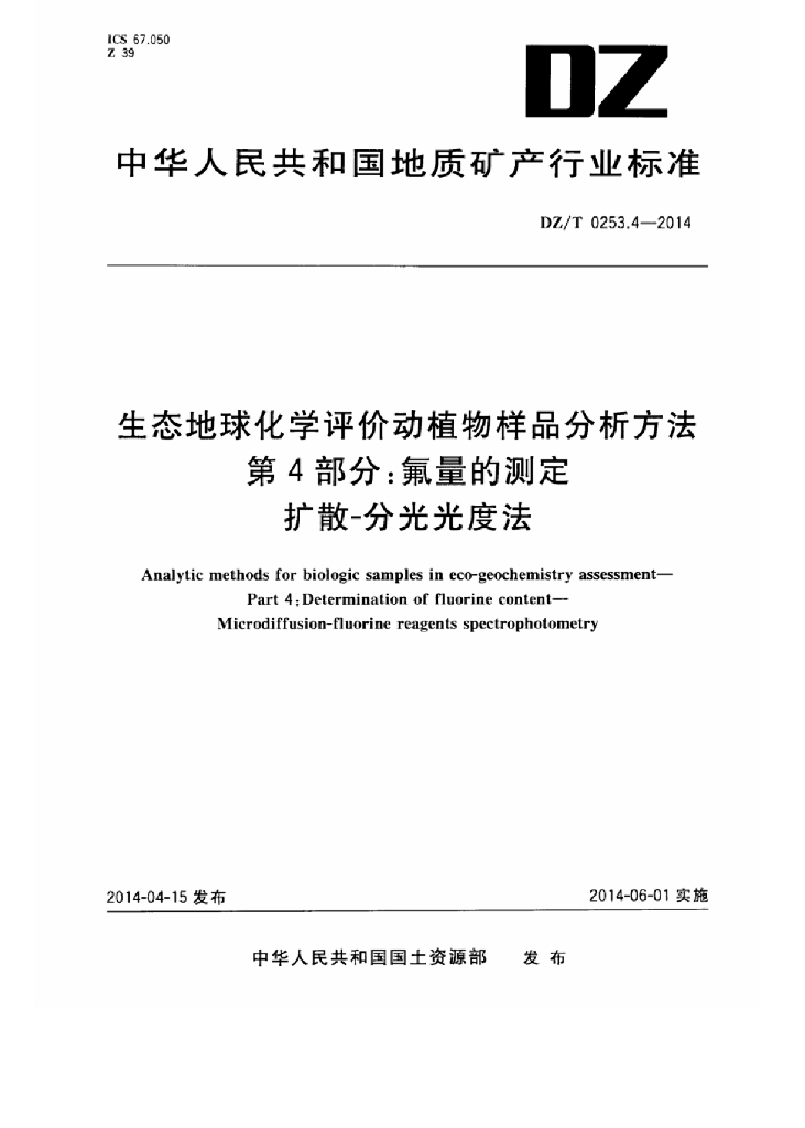 DZ/T 0253.4-2014 生态地球化学评价动植物样品分析方法 第4部分:氟量的测定扩散-分光光度法