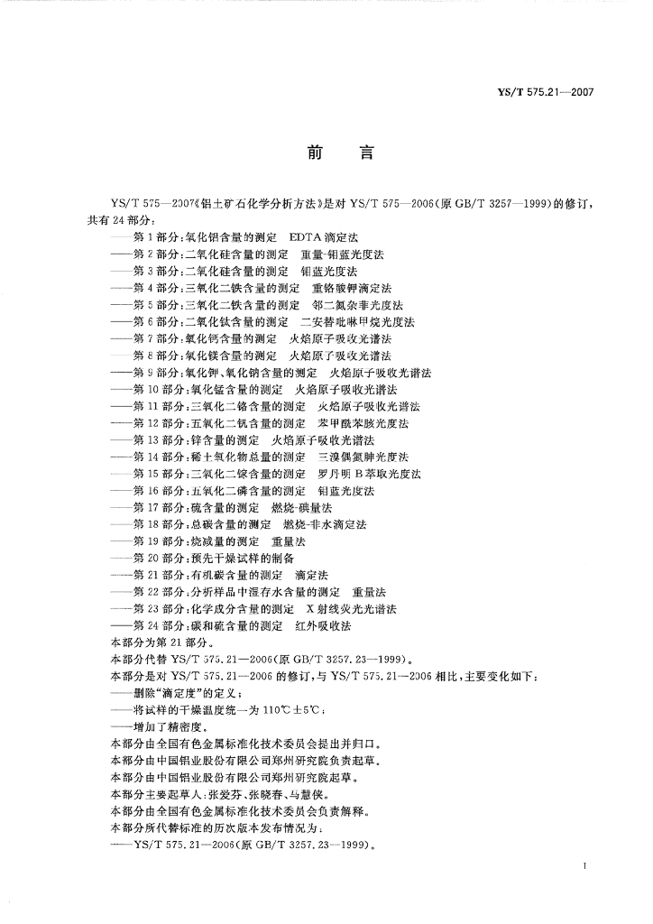 YS/T 575.21-2007 铝土矿石化学分析方法 第21部分:有机碳含量的测定 滴定法