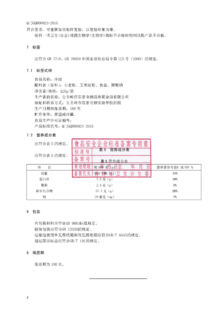 Q/JGQH 0002S-2015 公主岭市范家屯镇清海黄金面有限公司 冷面