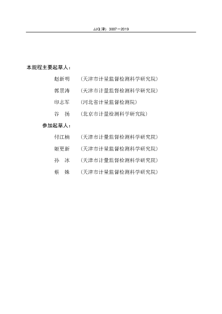 赵新明(天津市计量监督检测科学研究院)、郭景涛(天津市计量监督检测科学研究院)、印志军(河北省计量监督检测院)、谷扬(北京市计量检测科学研究院)、付江楠(天津市计量监督检测科学研究院)、姬更新(天津市计量监督检测科学研究院)、孙冰(天津市计量监督检测科学研究院)、蔡姝(天津市计量监督检测科学研究院)