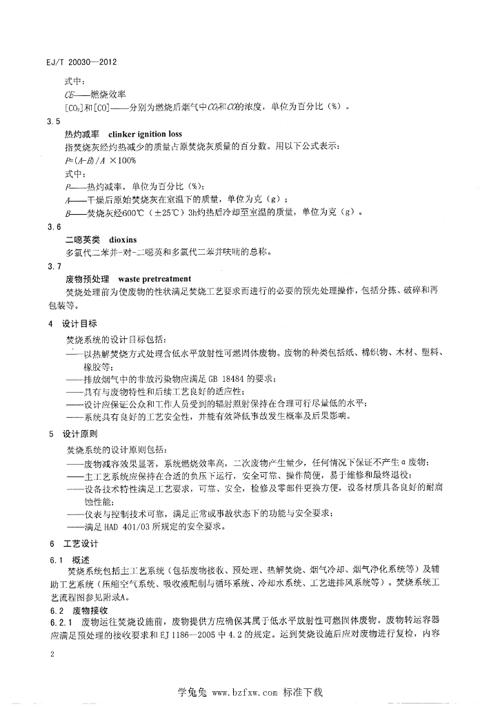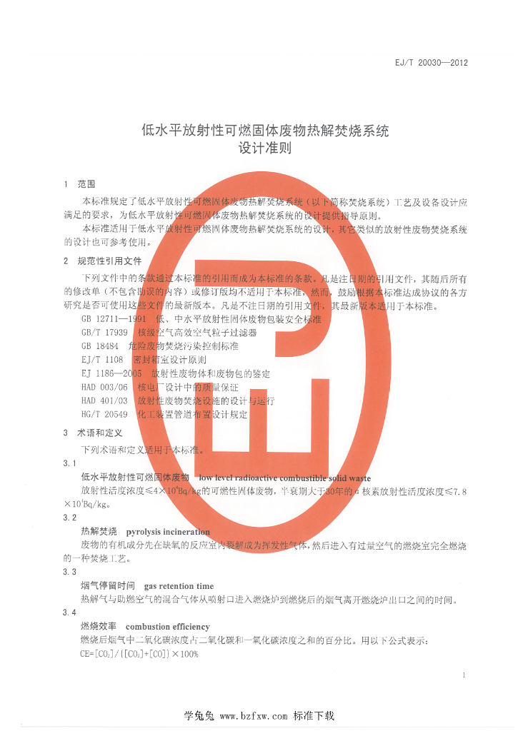 EJ/T 20030-2012 低水平放射性可燃固体废物热解焚烧系统设计准则