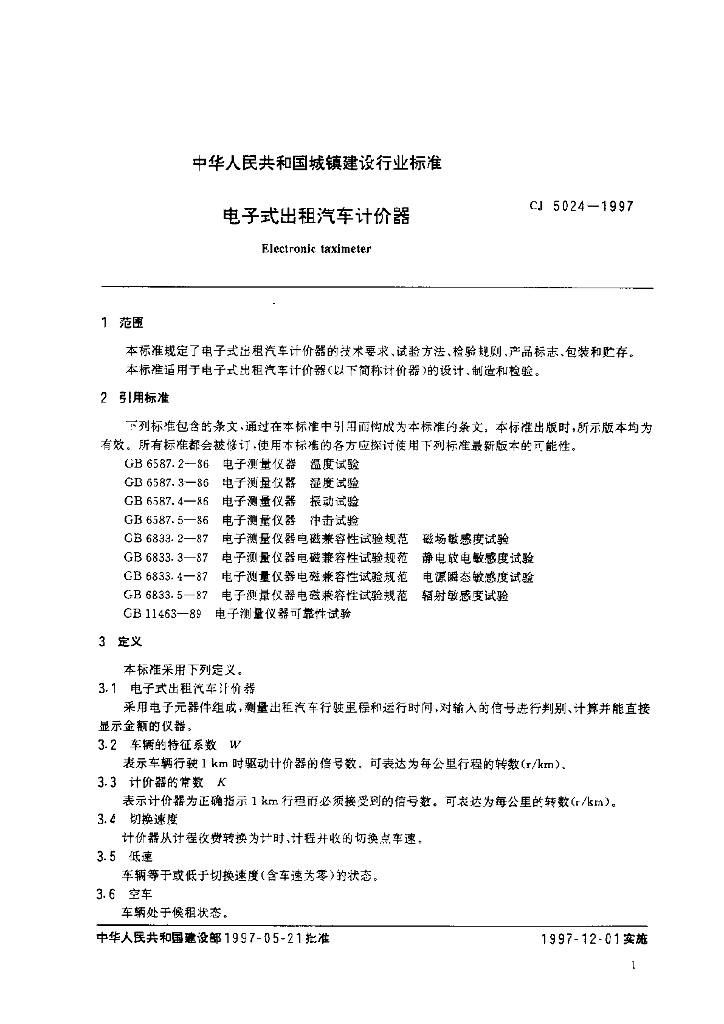 CJ 5024-1997 电子式出租汽车计价器