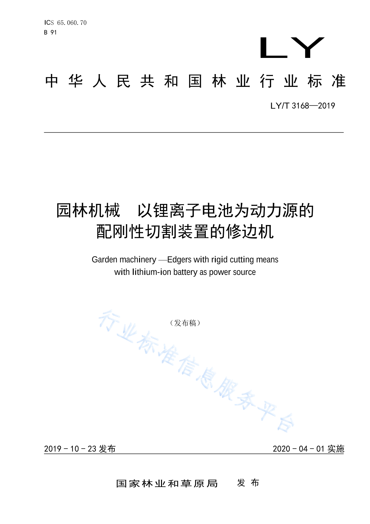 LY/T 3168-2019 园林机械 以锂离子电池为动力源的配刚性切割装置的修边机