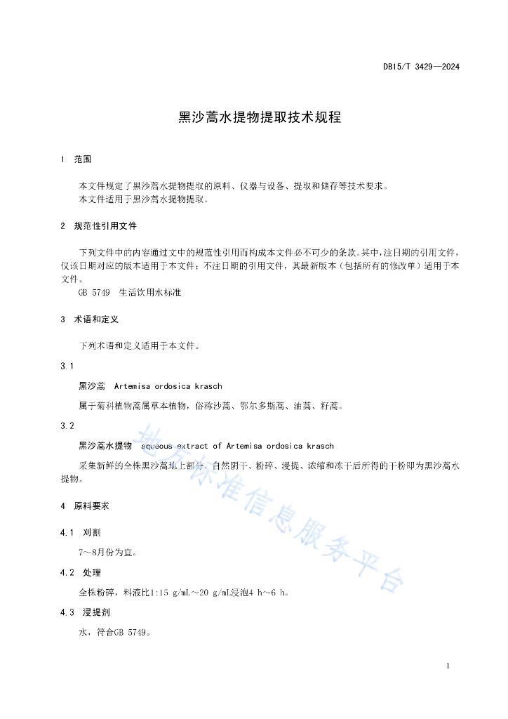 DB15/T 3429-2024 黑沙蒿水提物提取技术规程