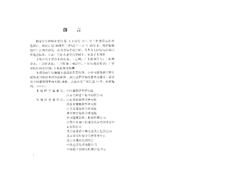 中国建筑科学研究院、江苏兴邦建工集团有限公司、山东省建筑科学研究院、河北省建筑科学研究院、江苏省建筑科学研究院、重庆市建筑科学研究院、中国建筑第四工程局有限公司、江苏科永和工程建设质量检测鉴定中心有限公司、北京市建设工程安全质量监督总站、北京市房屋安全管理事务中心、北京市建设监理协会、中铁建设集团有限公司、中电投工程研究检测评定中心
