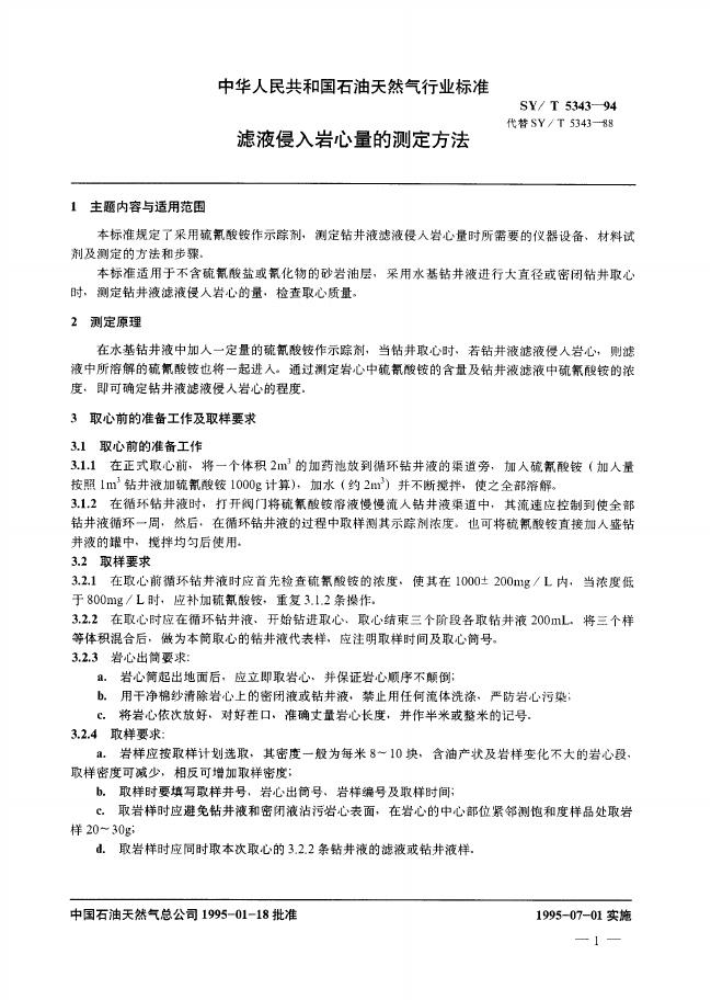 SY/T 5343-1994 滤液侵入岩心量的测定方法