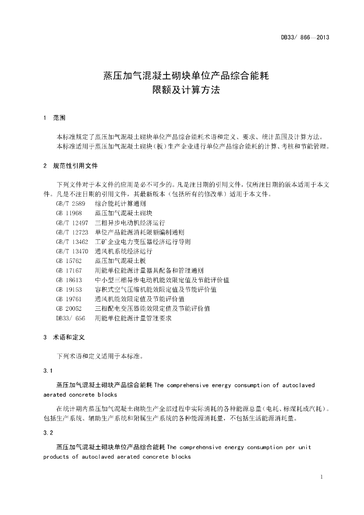 DB33/ 866-2013 蒸压加气混凝土砌块单位产品综合能耗限额及计算方法