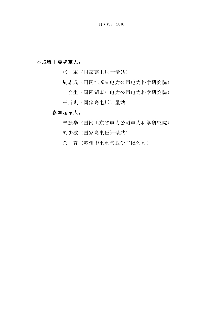 张军(国家高电压计量站)、周志成(国网江苏省电力公司电力科学研究院)、叶会生(国网湖南省电力公司电力科学研究院)、王斯琪(国家高电压计量站)、朱振华(国网山东省电力公司电力科学研究院)、刘少波(国家高电压计量站)、余青(苏州华电电气股份有限公司)