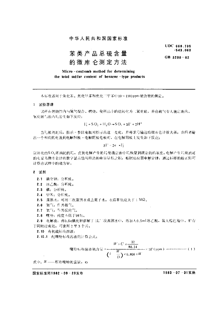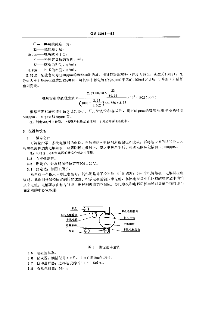GB/T 3208-1982 苯类产品总硫含量的微库仑测定方法
