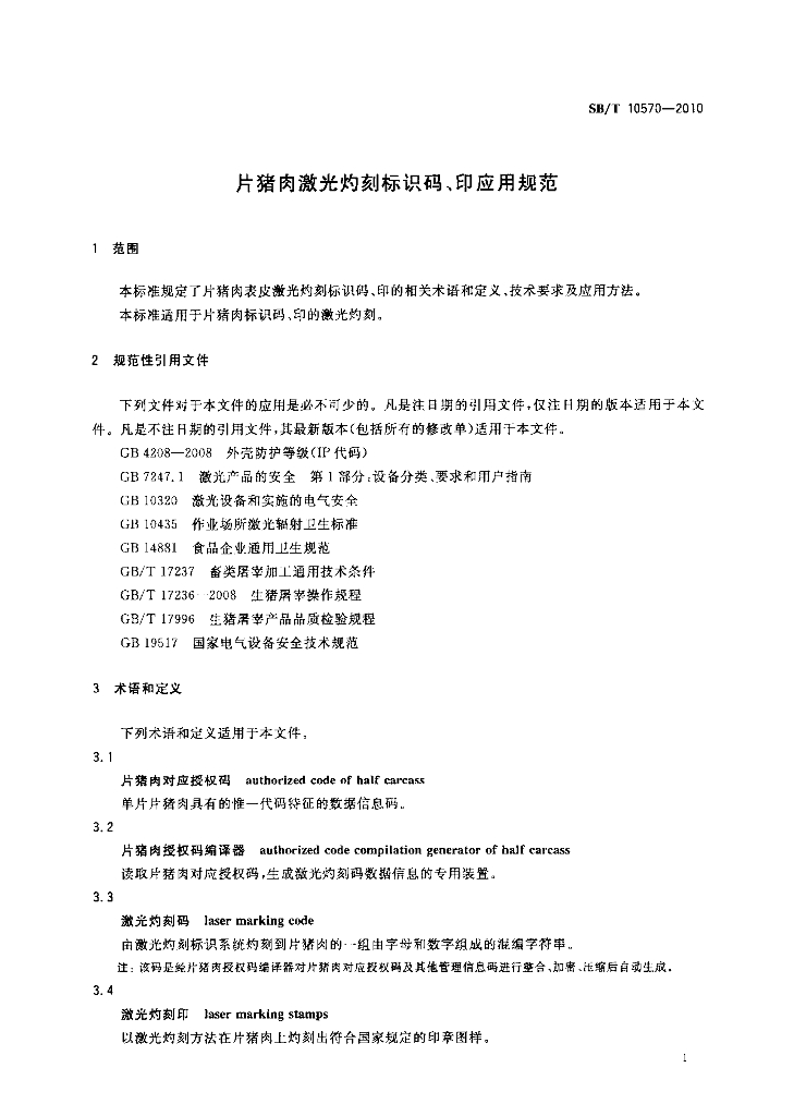 SB/T 10570-2010 片猪肉激光灼刻标识码、印应用规范