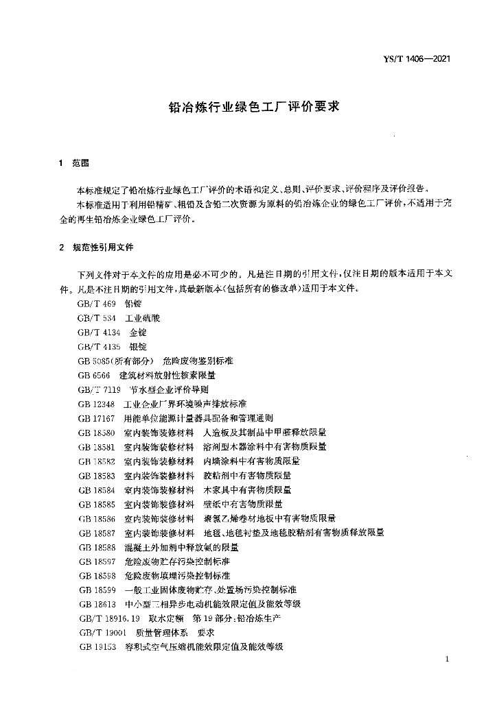 YS/T 1406-2021 铅冶炼行业绿色工厂评价要求