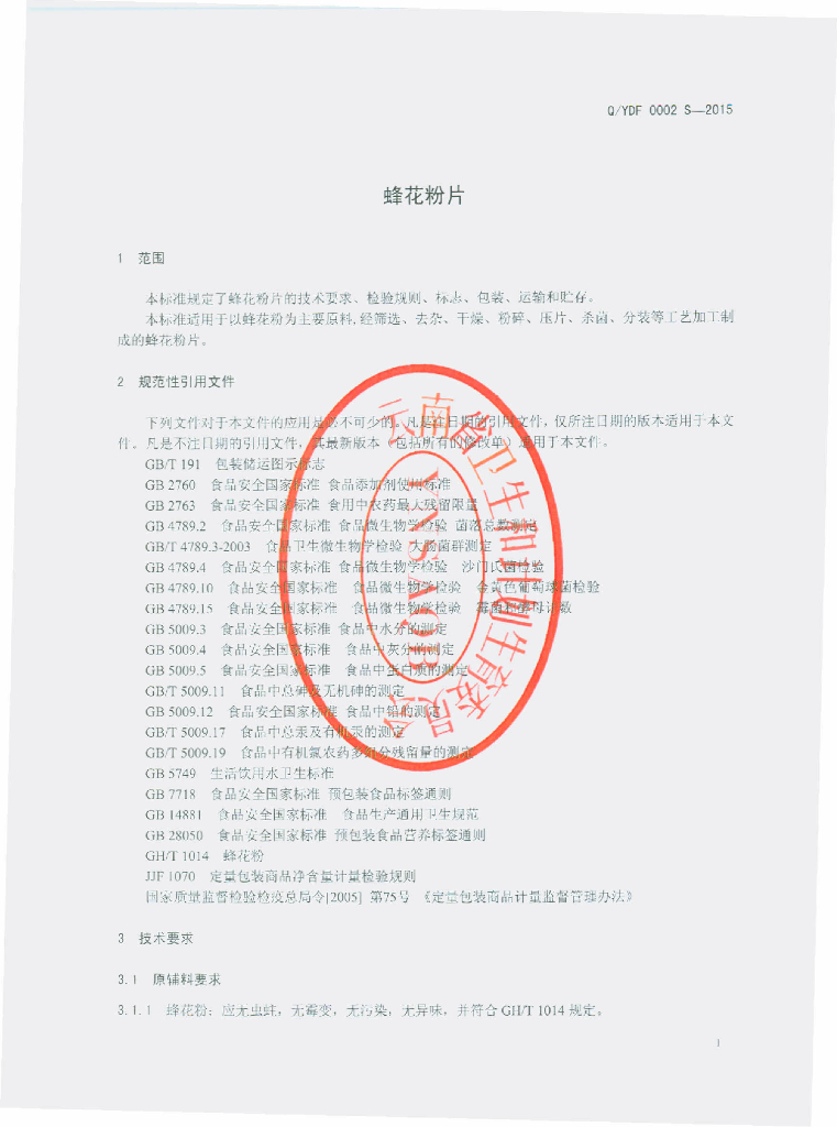 Q/YDF 0002S-2015 永胜滇峰蜂业有限责任公司 蜂花粉片