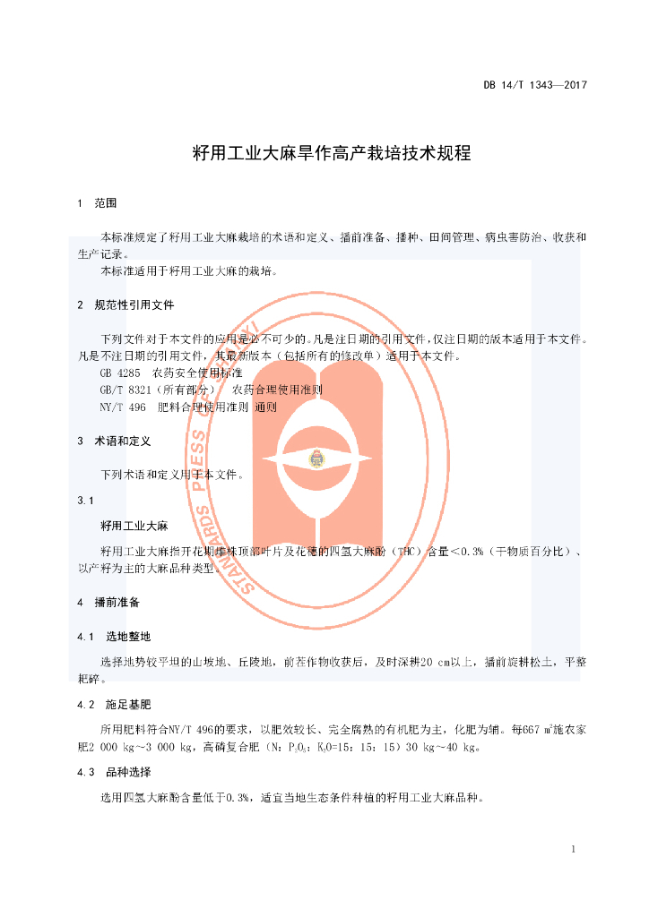 DB14/T 1343-2017 籽用工业大麻旱作高产栽培技术规程