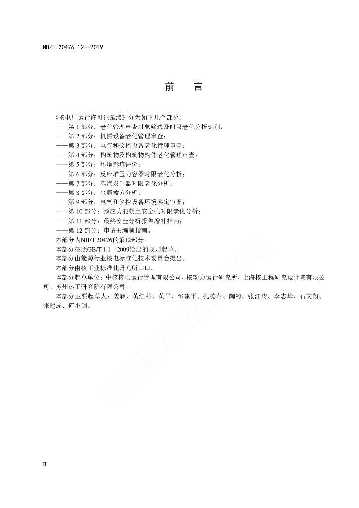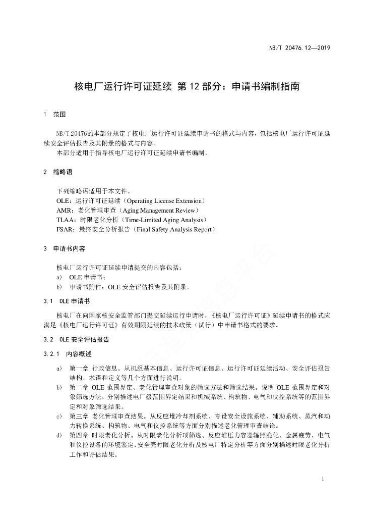 NB/T 20476.12-2019 核电厂运行许可证延续 第12部分:申请书编制指南